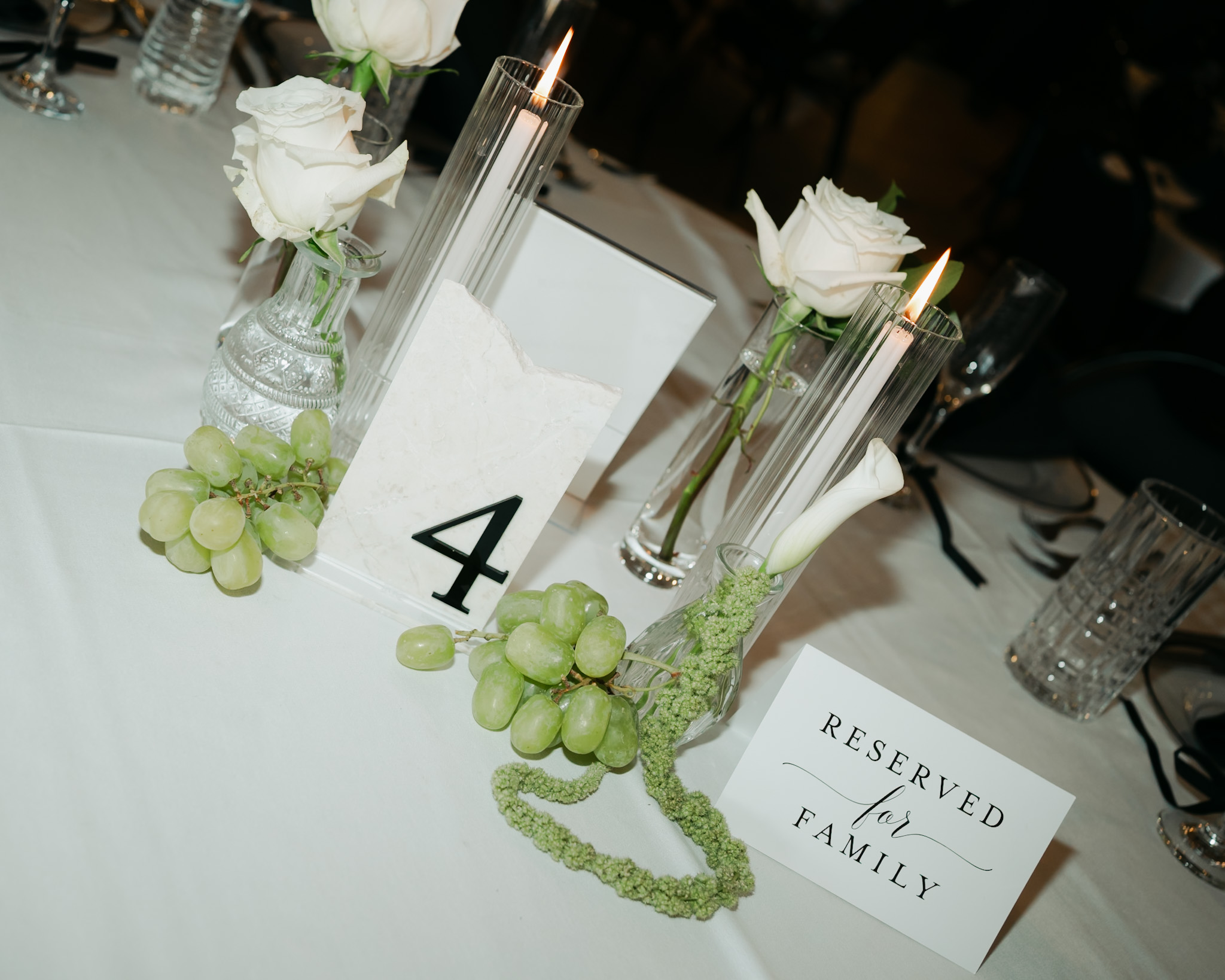 Their ceremony didn’t rely on dramatic landscapes—instead, it leaned into thoughtful design. Crisp white linens, sculptural florals, and a minimalist aesthetic that allowed every moment to feel intimate and deeply personal.